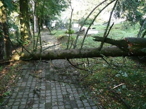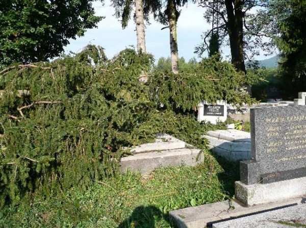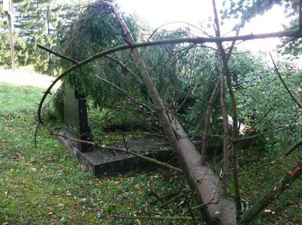 Ráno 20. augusta sa starosta vybral zisťovať škody po obci, či neležia nejaké polámané konáre na ceste, ale to čo ho čakalo na cintoríne, bolo neskutočné. V hornej časti sa chodník a hroby strácali pod vyváľanými stromami, ktoré vietor polámal ako zápalky a porozhadzoval po hroboch. Za obeť tejto veternej smršti padlo päť ihličnatých stromov, dva agáty a jedna lipa. Pohľad na zaplakanie. Nedalo sa ani zistiť, koľko hrobov je polámaných, alebo inak poškodených.